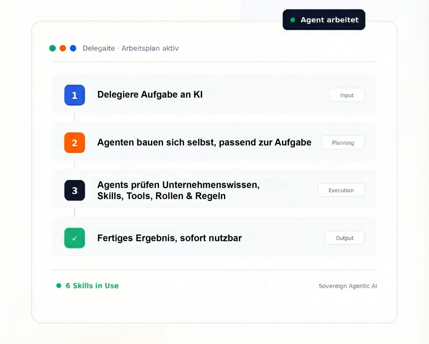 Die Plattform erstellt automatisch einen strukturierten Arbeitsplan, koordiniert spezialisierte KI-Agenten und liefert das Ergebnis im gewünschten Format – als Datei, Dokument oder Report. Dabei greift jeder Agent nur auf die Rechte und Tools zu, die für seine Teilaufgabe freigegeben sind. Vollständige Protokollierung für interne Nachvollziehbarkeit und Compliance ist standardmäßig enthalten.